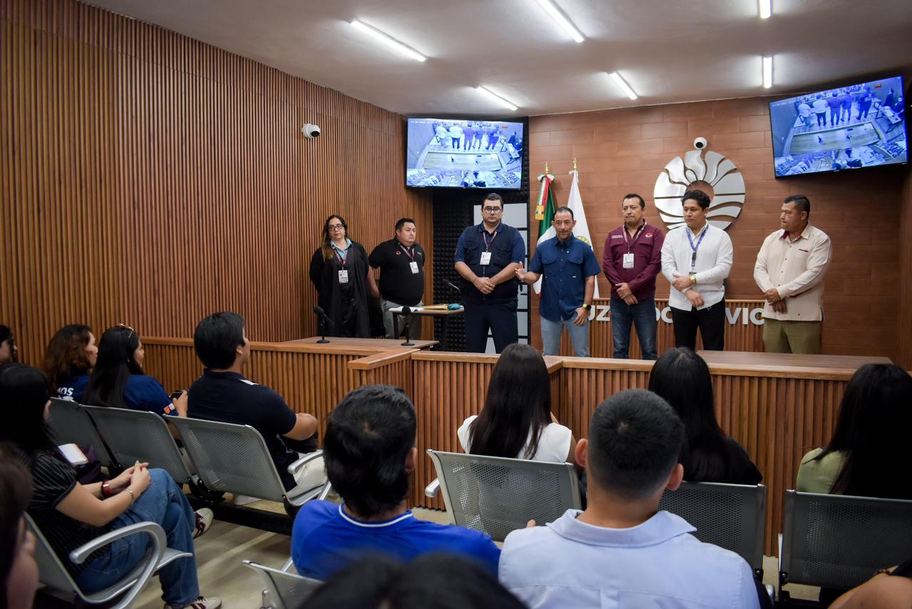 En representación de la Presidenta Municipal, Ana Paty Peralta, el funcionario encabezó un recorrido por la sala de audiencias orales ubicada en la Supermanzana 247, donde las y los jóvenes conocieron de cerca el funcionamiento del nuevo modelo de justicia cívica, así como el papel que desempeñan jueces, secretarios, defensores y demás participantes dentro de una audiencia.