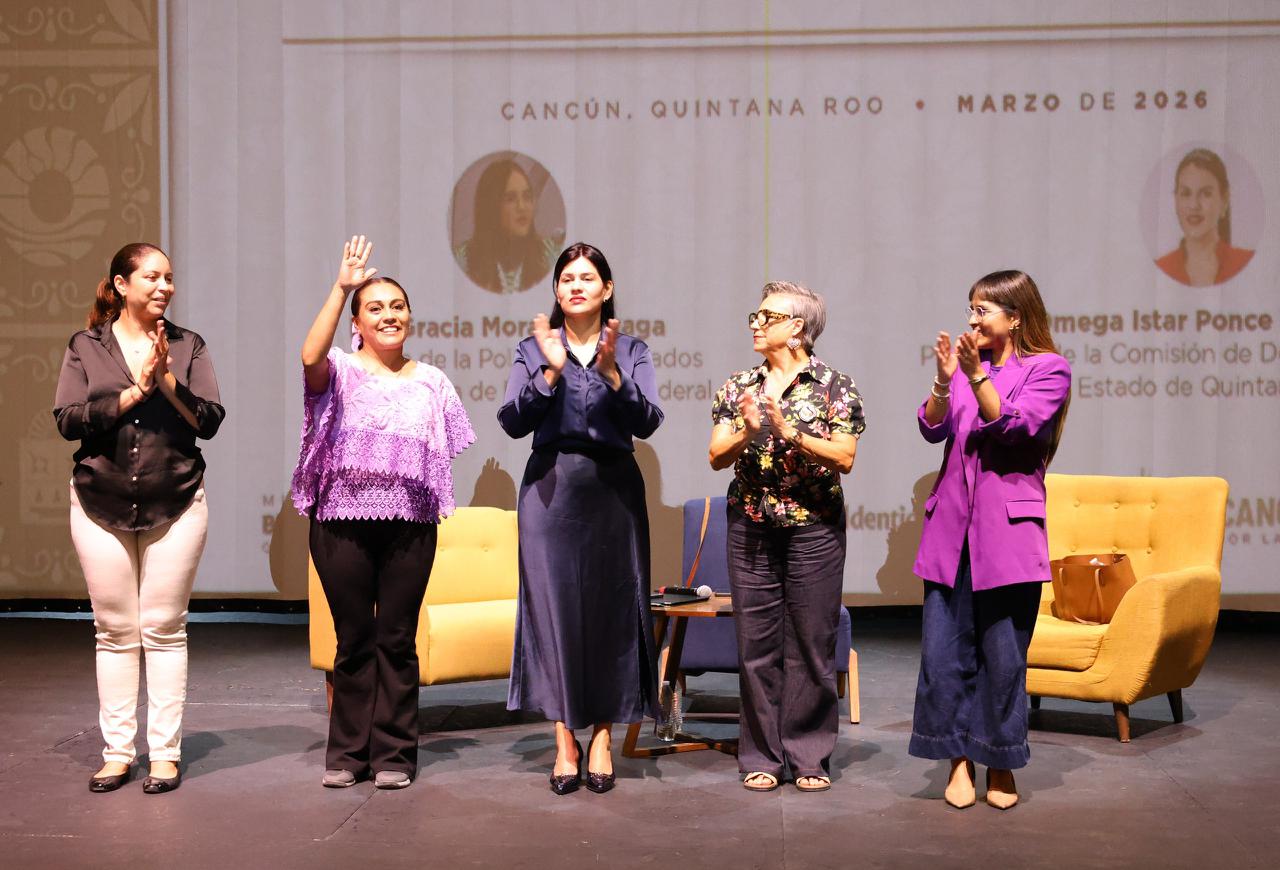 Esta exposición contó con la presidenta de la Comisión de Derechos Humanos del Estado de Quintana Roo, Omega Istar Ponce Palomeque y la directora de Políticas de Cuidado en la Secretaría de las Mujeres, Gracia Morales Alzaga, quienes abordaron temas relacionados con los derechos de las mujeres, las relaciones igualitarias y la construcción de comunidad.