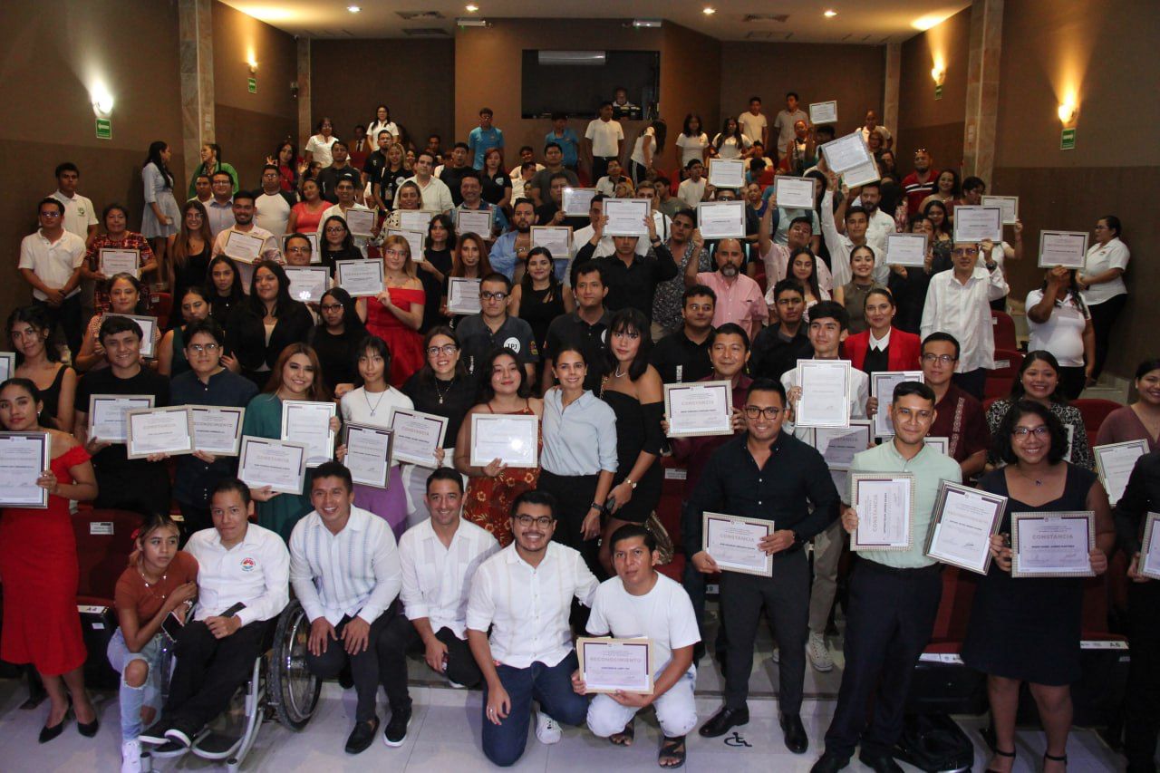 “Les agradezco a todas y todos los jóvenes por todo su esfuerzo, por su dedicación, por su compromiso, y por siempre dar ese ejemplo a las generaciones cancunenses más pequeñas. Cada vez estamos haciendo más espacios para los jóvenes, para que ustedes puedan aprovecharlos al máximo, porque creo firmemente que las y los jóvenes son el presente y los principales agentes de cambio para la transformación, así que los invito a seguir caminando sobre la misma línea, muchas felicidades a todas y todos”, señaló la Presidenta Municipal ante decenas de jóvenes que abarrotaron el teatro.