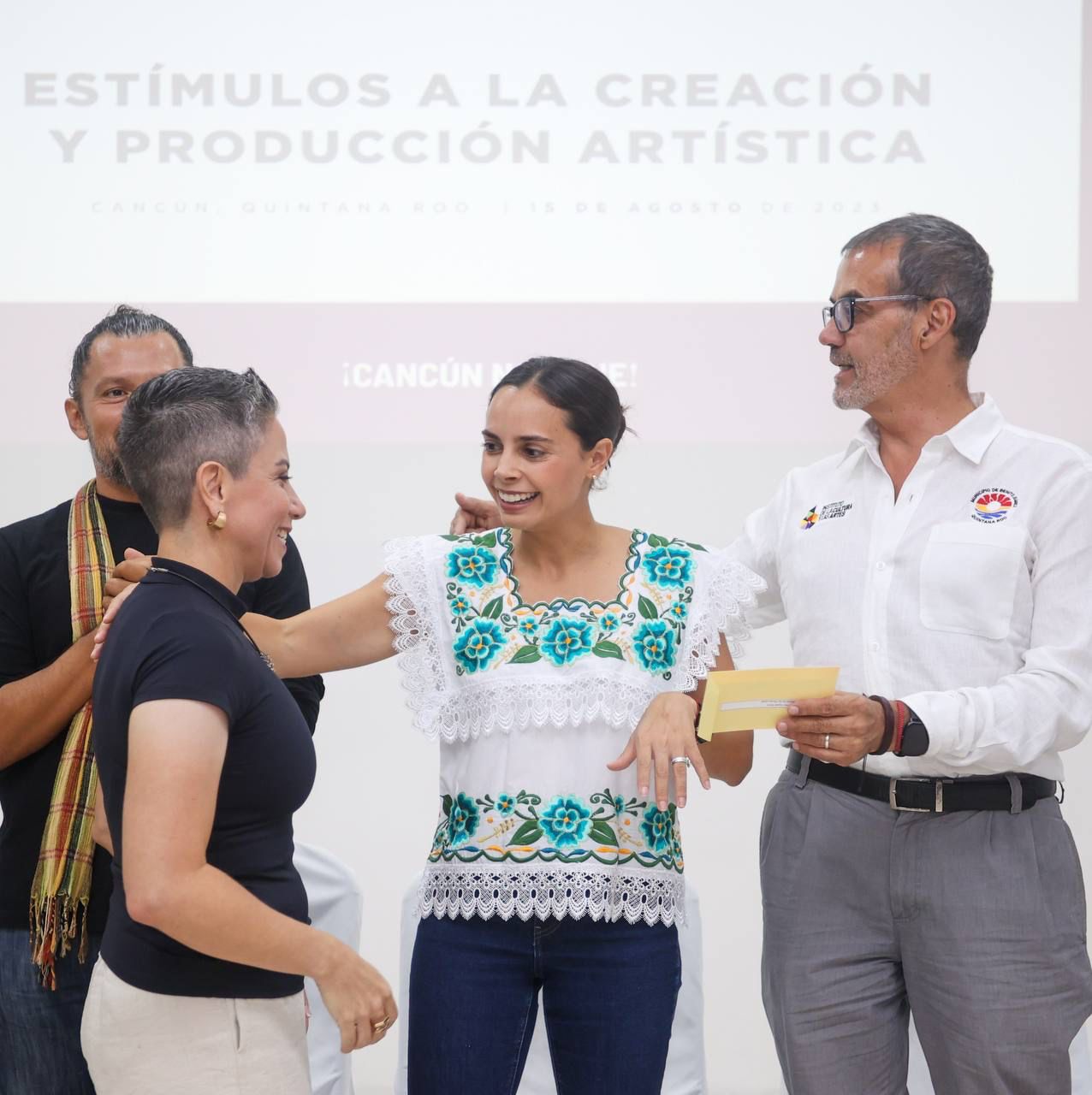 Cancún, Q. R., a 15 de agosto de 2023.- Con el objetivo de impulsar el talento local, así como de difundir la creación artística en Cancún, la Presidenta Municipal de Benito Juárez, Ana Paty Peralta, realizó la entrega de 15 cheques como estímulo económico a mismo número de artistas cancunenses, quienes conformaron un total de 20 ganadores, como fomento para la creación de artes escénicas, literaturas y artes visuales.