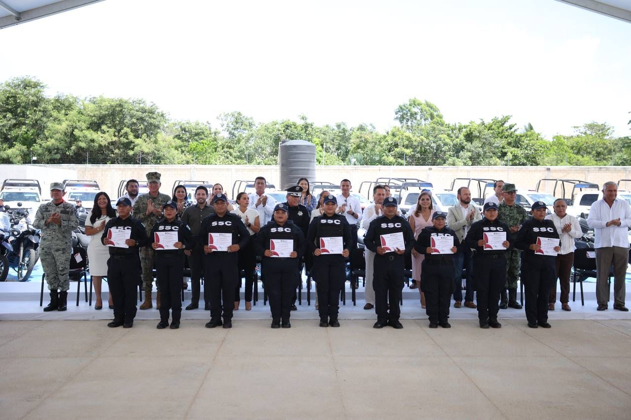 Aunado a la entrega del parque vehicular y armamento, durante el protocolo se otorgaron reconocimientos a 18 graduados del Grupo Especializado en Atención a la Violencia Familiar y de Género (GEAVIG), quienes durante cinco meses se capacitaron en temas como: proximidad social, contención emocional, psicología, disturbios civiles, acondicionamiento físico, primeros auxilios, detención y traslado de personas; así como en materia de perspectiva de género, derechos humanos, natación; trabajo en equipo, liderazgo, inglés, maya, violencia familiar y primer respondiente, cuyo fin es atender las demandas de la ciudadanía encaminadas a la erradicación de la violencia familiar y de género.