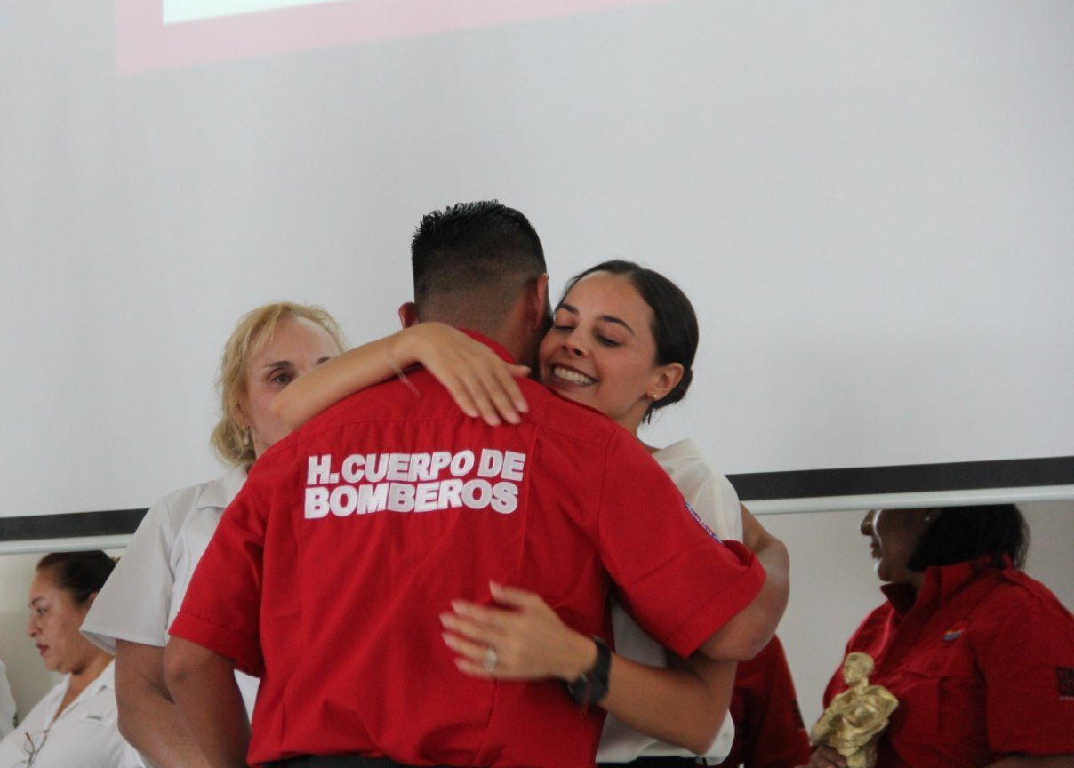 Conmovida por observar a una niña vestida con el uniforme de bombero, la Primera Autoridad se acercó para decirles a las y los hijos de los bomberos, que deben sentirse orgullosos del desempeño de sus papás, quienes son los héroes sin capa de Cancún.