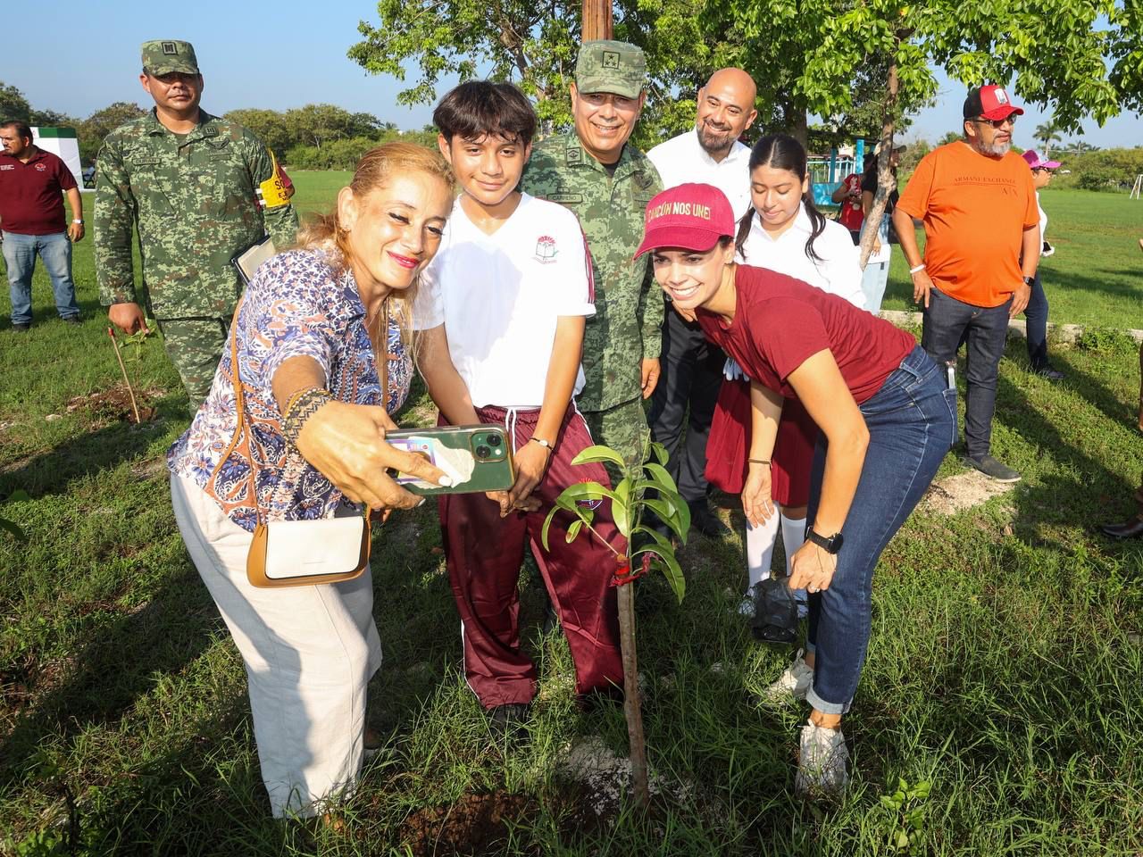 Luego de participar todos en la ordenanza al Lábaro Patrio, acompañada por el Coronel del 64° Batallón de Infantería, general Samuel Javier Carreño; el presidente del comisariado ejidal, Reyes Antonio de la Rosa Muñoz y el delegado de Bonfil, José González Vázquez, la Presidenta Municipal participó en la reforestación de las áreas verdes, a la que se sumaron también jóvenes del Colegio de Bachilleres Plantel 3, alumnos de la secundaria “Rosario Castellanos” y personal de varias dependencias.
