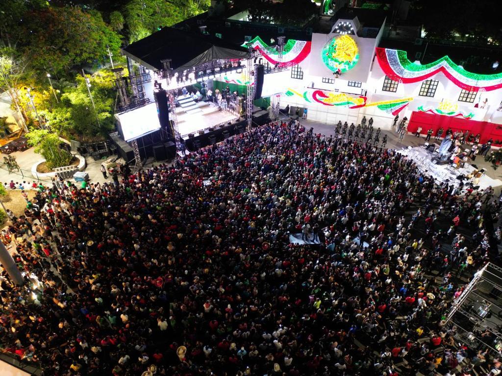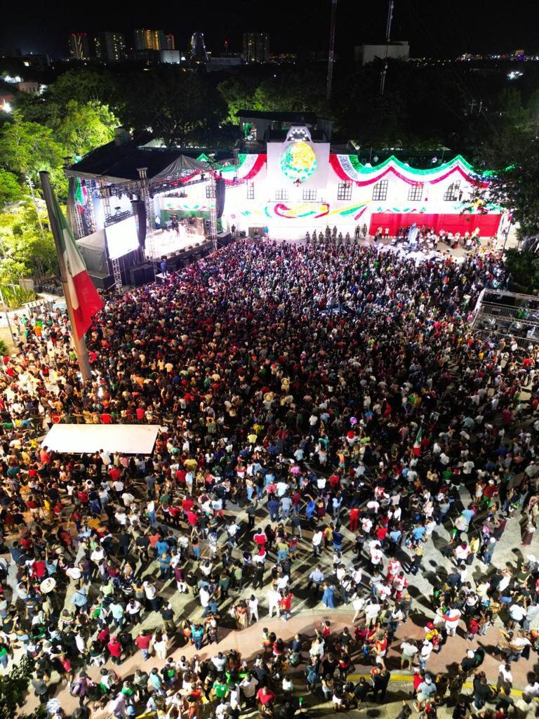 Cancún, Q. R., a 15 de septiembre de 2023.- Ante más de 15 mil personas que se dieron cita en la Plaza de la Reforma del Palacio Municipal, para mostrar su fervor patrio en esta fecha, la Presidenta Municipal, Ana Paty Peralta, emuló a los héroes que hicieron libre a la Nación, al encabezar la ceremonia del 213 Grito de Independencia con una fiesta colorida y sana para las familias cancunenses sin pirotecnia ni alcohol.