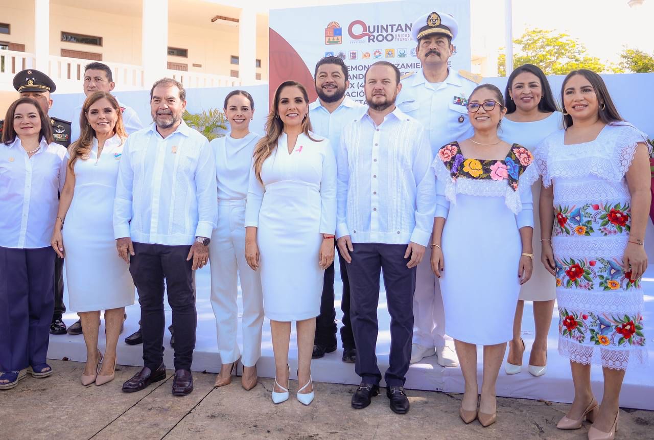 Con las notas del Himno a Quintana Roo, los ahí presentes ratificaron la identidad y raíces del pueblo quintanarroense, para posteriormente presenciar el ascenso del lábaro patrio en lo más alto del asta bandera del Palacio de Gobierno de la ciudad de Chetumal, donde la Primera Autoridad Municipal acompañó a las autoridades a tan importante evento.