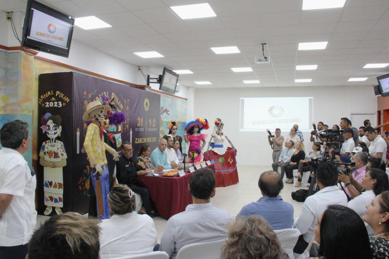 Cancún, Q. R., a 16 de octubre de 2023.- En conferencia de prensa, autoridades municipales dieron a conocer el programa cultural, artístico y gastronómico de la tercera edición del “Hanal Pixán 2023”, el cual se ha convertido en una tradición para Cancún, y parte de las raíces mexicanas donde se conmemora a los fieles difuntos en el marco del Día de Muertos, que además será a beneficio del Sistema para el Desarrollo Integral de la Familia (DIF) Benito Juárez.