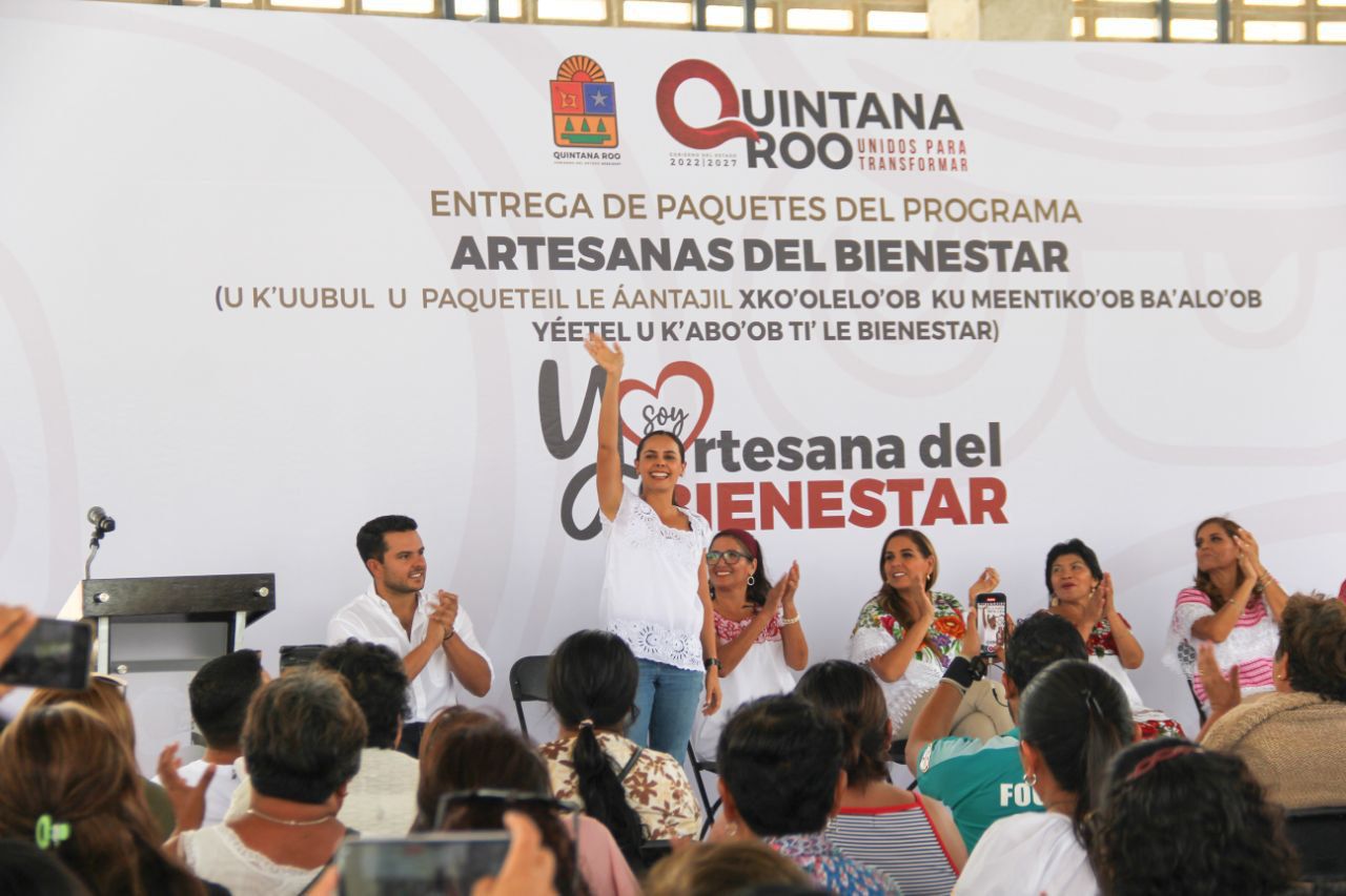 Cancún, Q. R., a 18 de octubre de 2023.- En su calidad de anfitriona en Cancún, la Presidenta Municipal de Benito Juárez, Ana Paty Peralta, colaboró en la entrega de más de 700 paquetes del Programa “Artesanas del Bienestar”, encabezado por la gobernadora Mara Lezama, con el fin de impulsar el desarrollo humano y económico de las personas, a fin de generar oportunidades de empleo para que obtengan ingresos familiares.