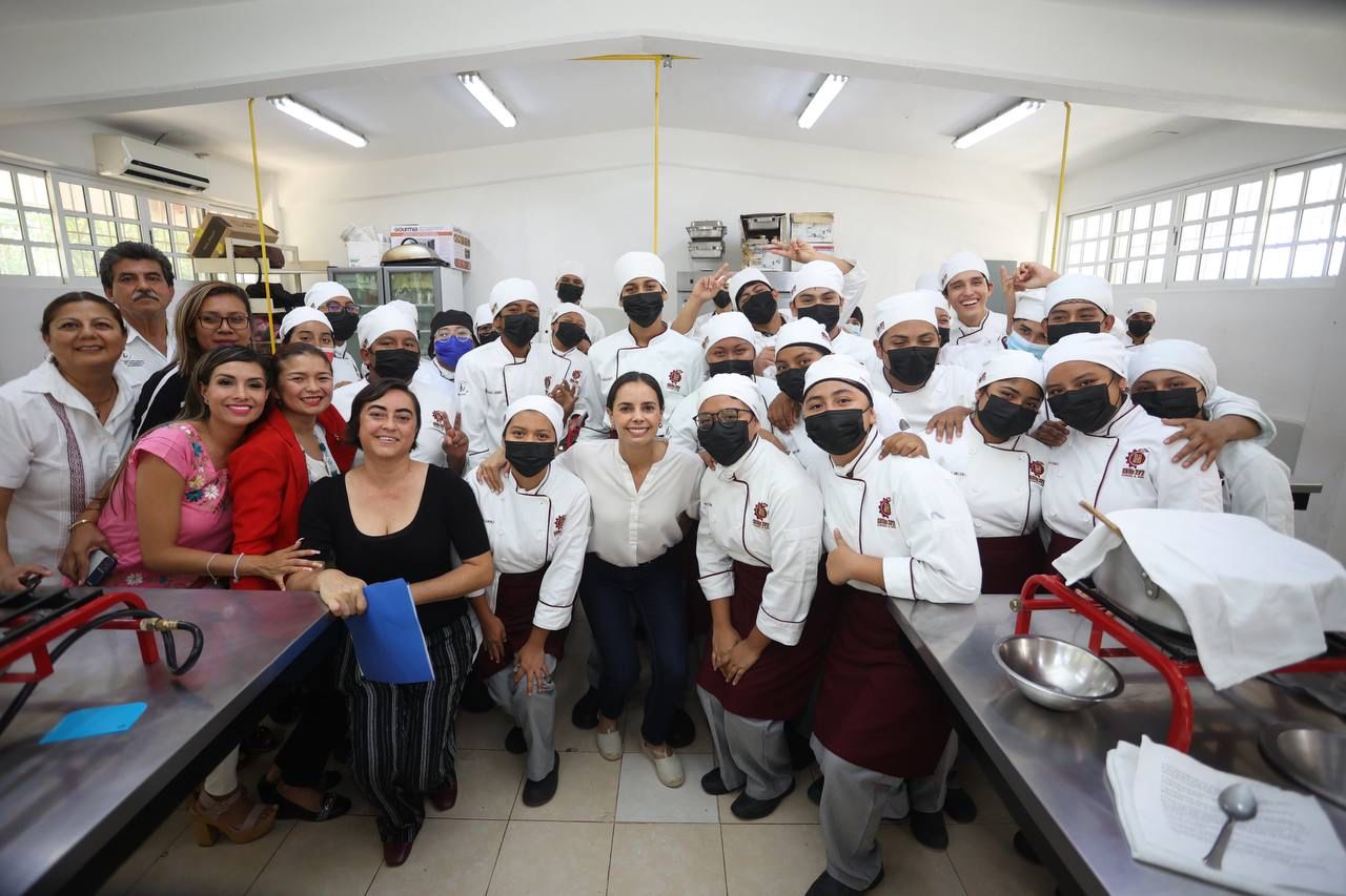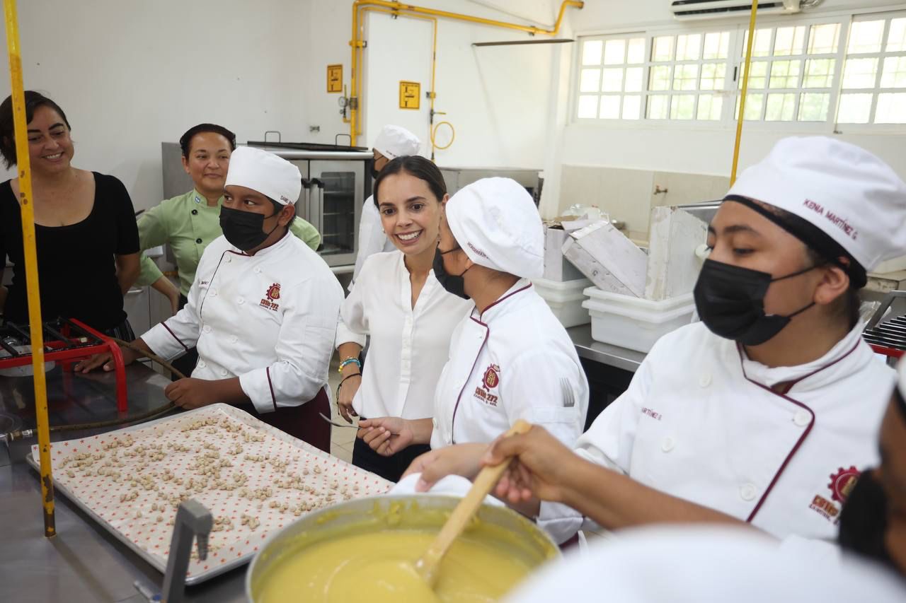 Para conocer un poco de lo que aprenden en ese plantel, la Presidenta Municipal pasó a saludar a los alumnos de cuarto semestre que estaban en el taller de Alimentos y Bebidas en una práctica de elaboración de postres correspondiente a un brownie y un pay de limón, y contentos de tenerla cercana a ellos, los estudiantes la invitaron a presenciar el concurso Copa Chef 2023 el próximo 1° de junio, en el que participarán junto con todos los CBTIS de Quintana Roo.