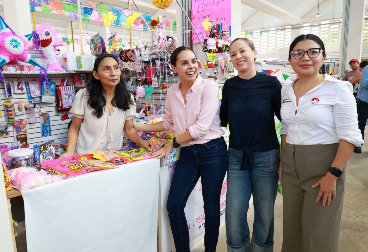 De los 61 locales, precisó, 55 se encuentran abiertos ofertando jugos y licuados, dulcería, artesanías, novedades, venta de ropa, jarcería, cremería, tecnología, electrodomésticos, papelería, alimentos preparados y florería. Durante su visita, uno de los locatarios obsequió a la Alcaldesa una rosa roja en agradecimiento por el apoyo a la economía de sus familias.
