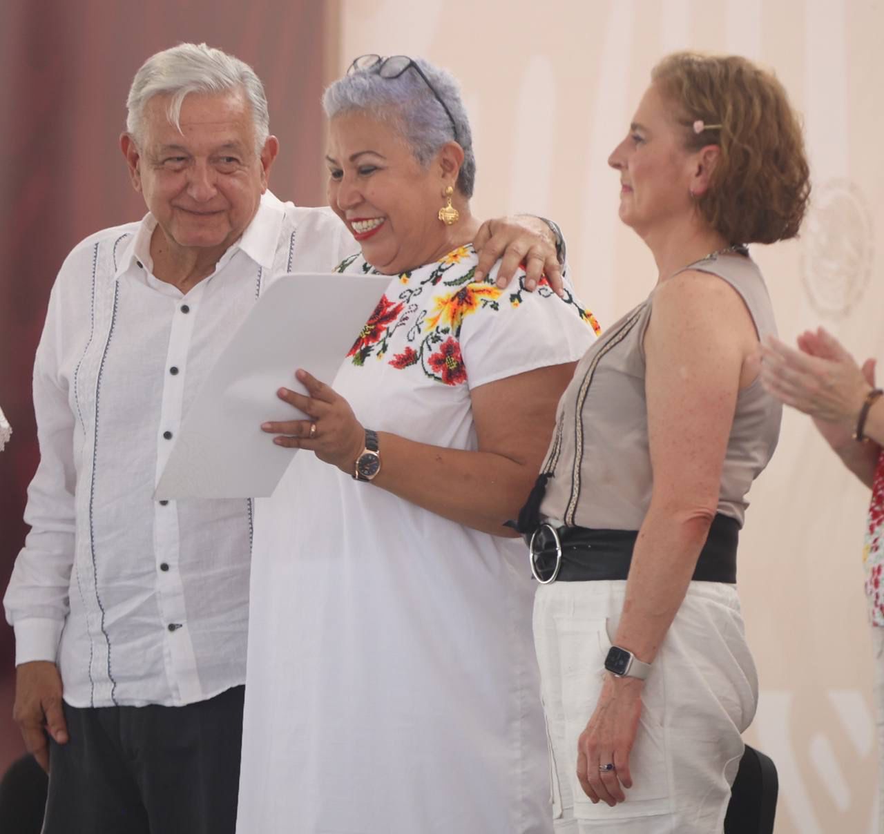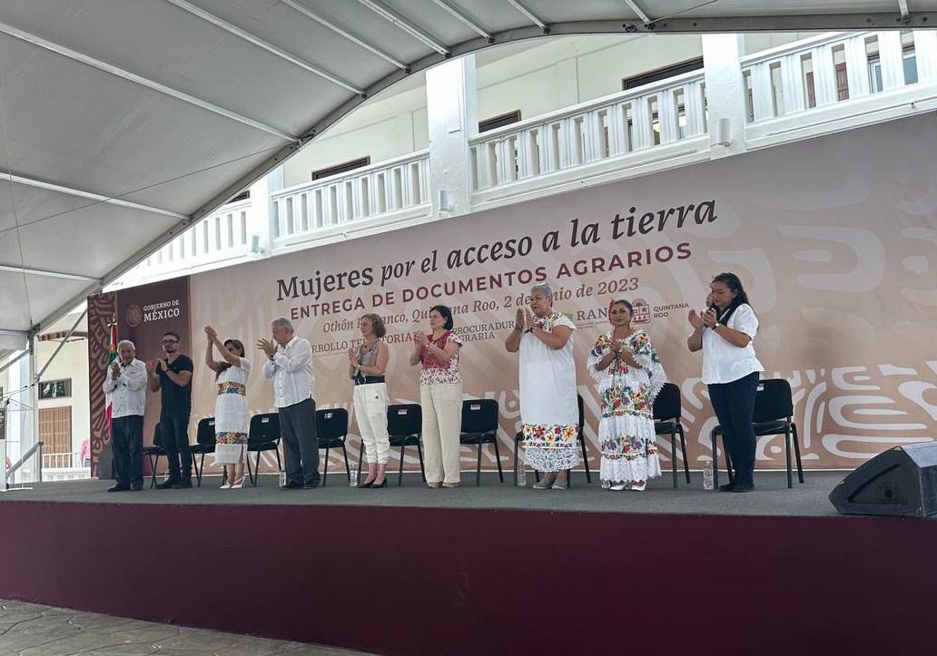 Chetumal, Q.R., a 02 de junio de 2023.- “Solo nuestro presidente ha hecho justicia y devuelto la esperanza a las mujeres. Como lo dijo la doctora Beatriz Gutiérrez Müller, éstas eran tierras de sus ancestros y hoy las mujeres reciben estos títulos que les dan certeza jurídica”, comentó la Presidenta Municipal de Benito Juárez, Ana Paty Peralta, tras atestiguar la entrega de certificados de derechos agrarios a favor de beneficiarias del programa federal "Mujeres por el acceso a la tierra", encabezada por el Presidente Andrés Manuel López Obrador y la gobernadora, Mara Lezama.