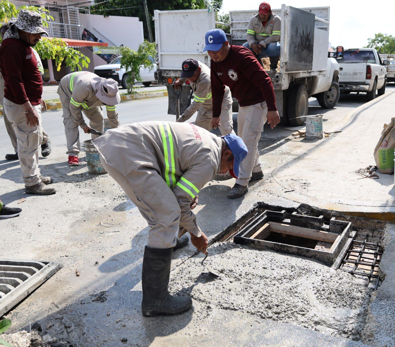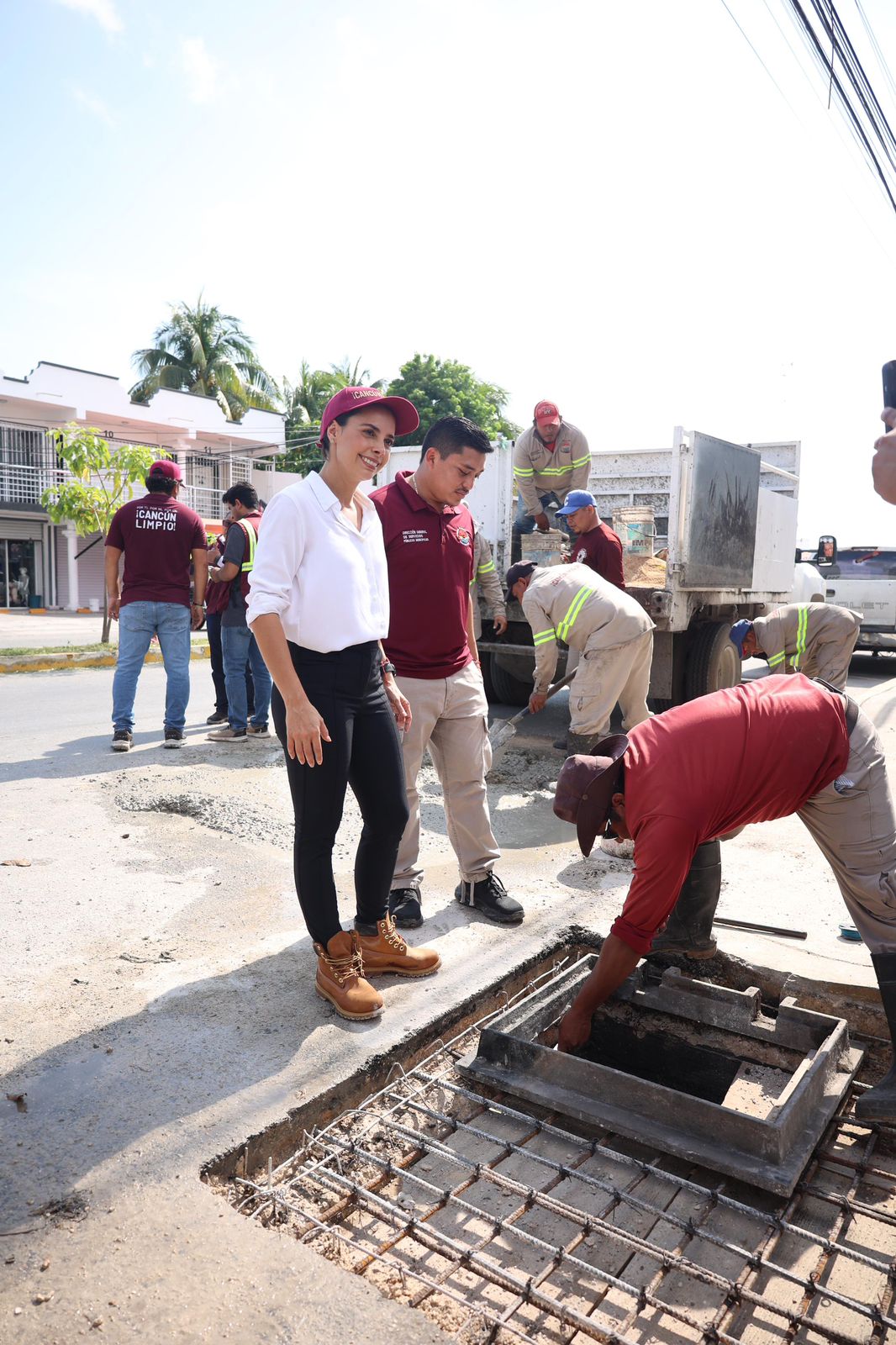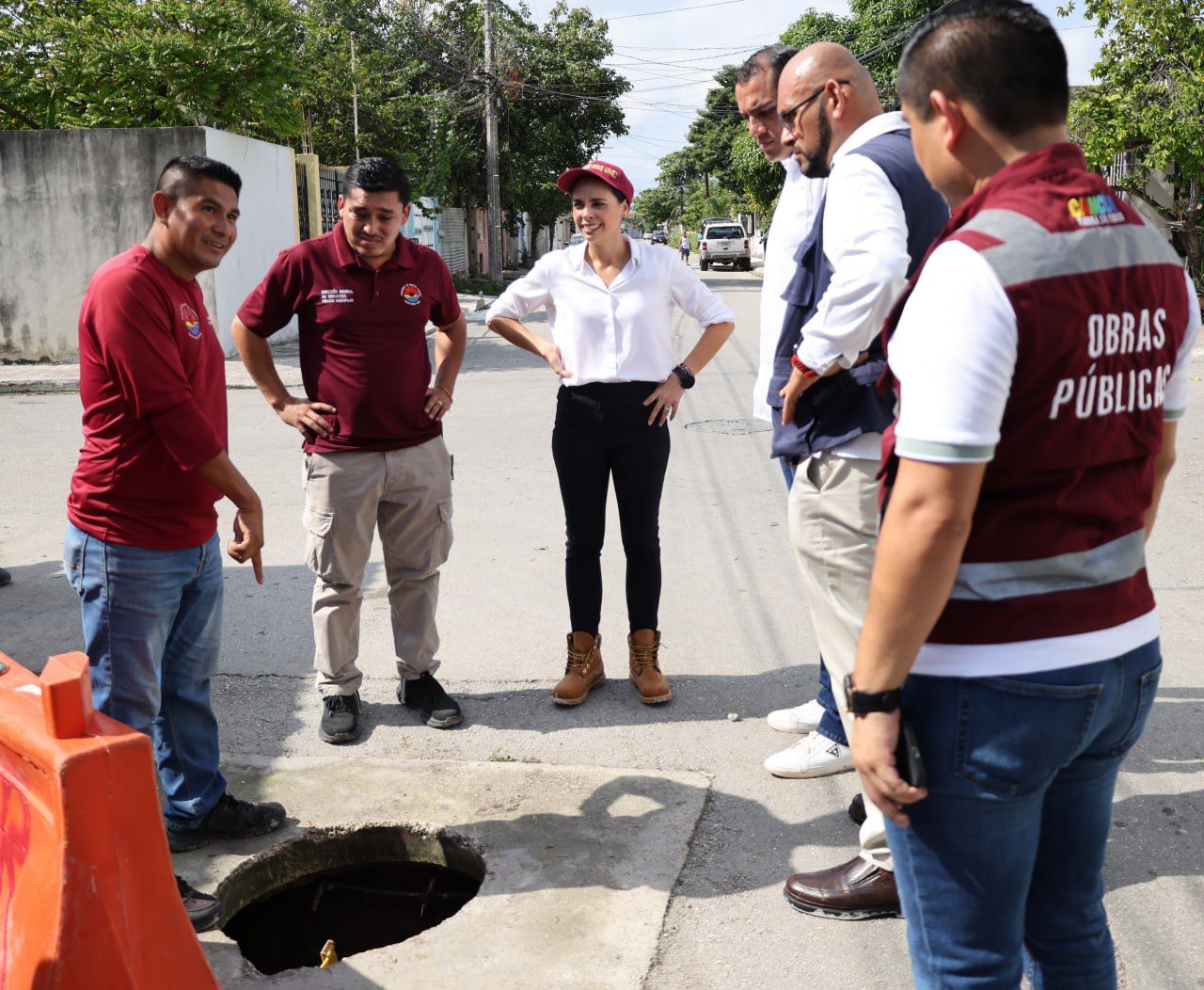 “Hoy se está reparando un pozo de absorción que se había hundido y estamos atendiéndolo, el día de hoy queda listo este pozo, les pedimos únicamente a las y los vecinos de esta Supermanzana 510, que tengan un poco de cuidado en esta zona de reparación”, dijo la Primera Autoridad Municipal, al observar las maniobras de reparación en la Av. México con Calle 42 de la supermanzana en mención.