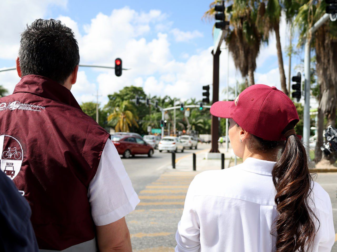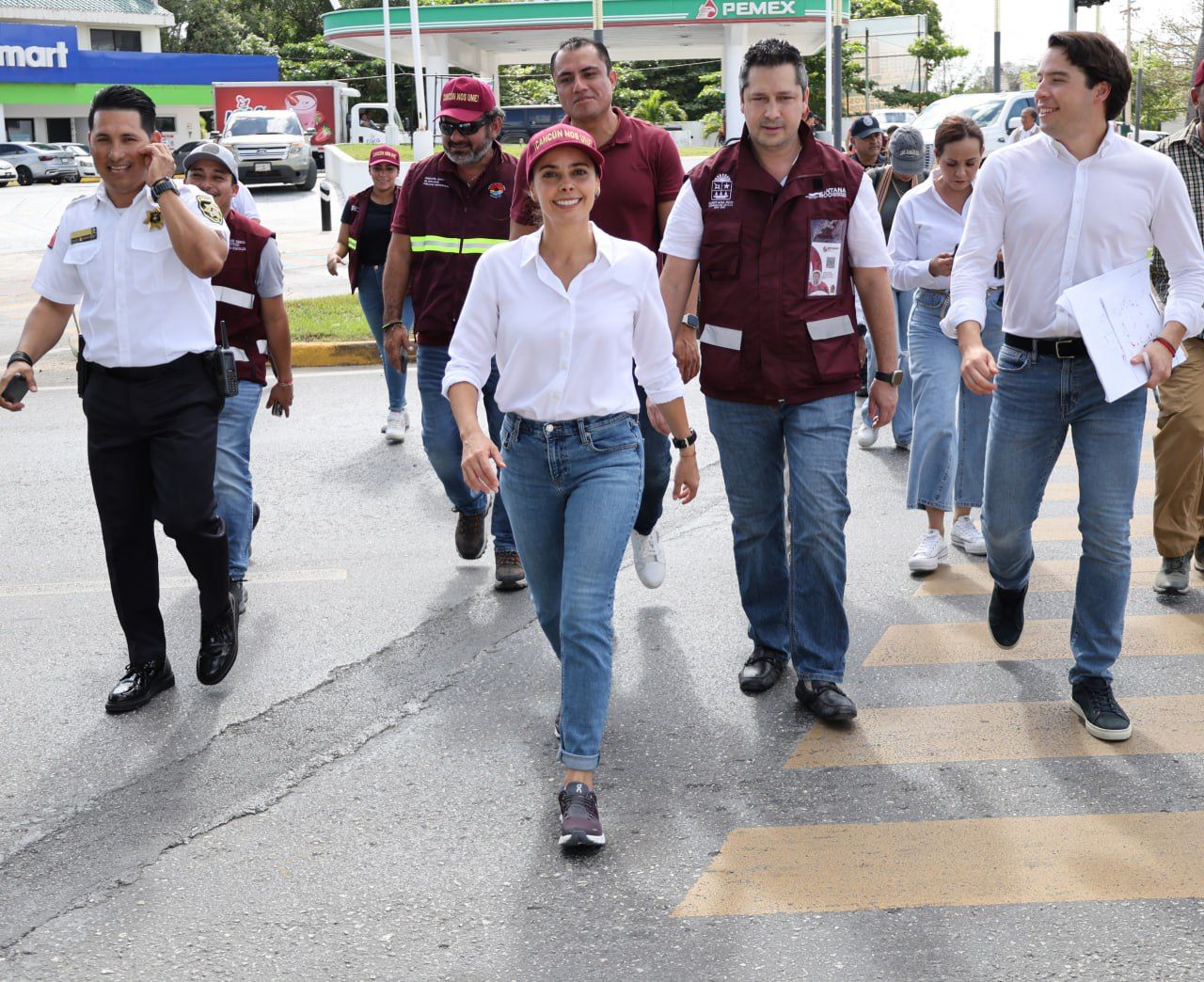 Durante la visita por diversas interacciones de la ciudad, que inició en la Av. Cobá con Av. Tankah, la Presidenta Municipal, Ana Paty Peralta, caminó por las banquetas destinadas para los peatones, vigiló minuciosamente los bolardos, rampas, líneas podotáctiles, guarniciones, banquetas, semáforos, avisos sonoros, pintura y señaléticas, que son parte de este programa primordial para mejoras a la imagen urbana de Cancún.