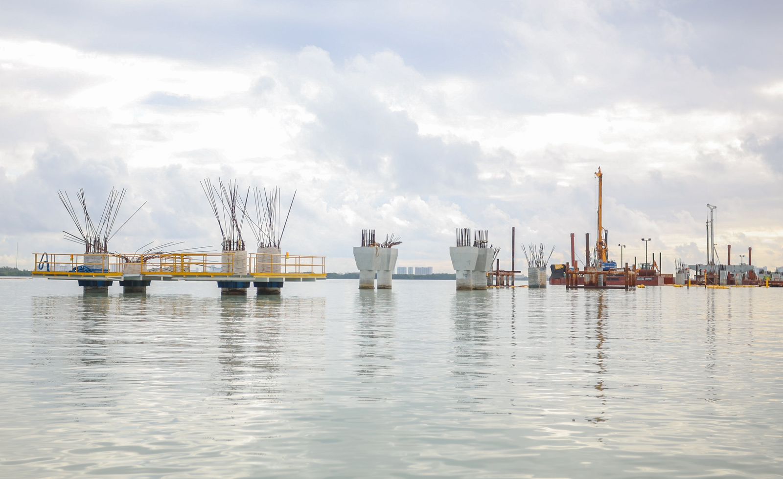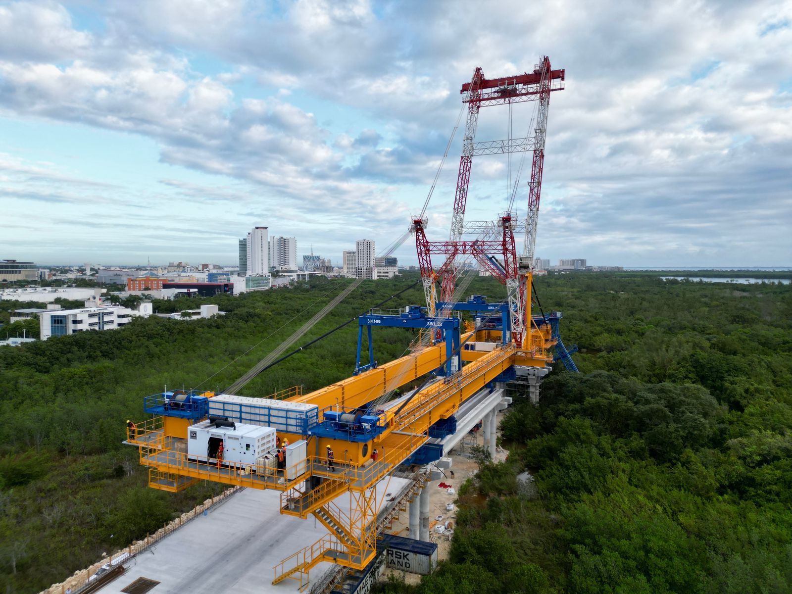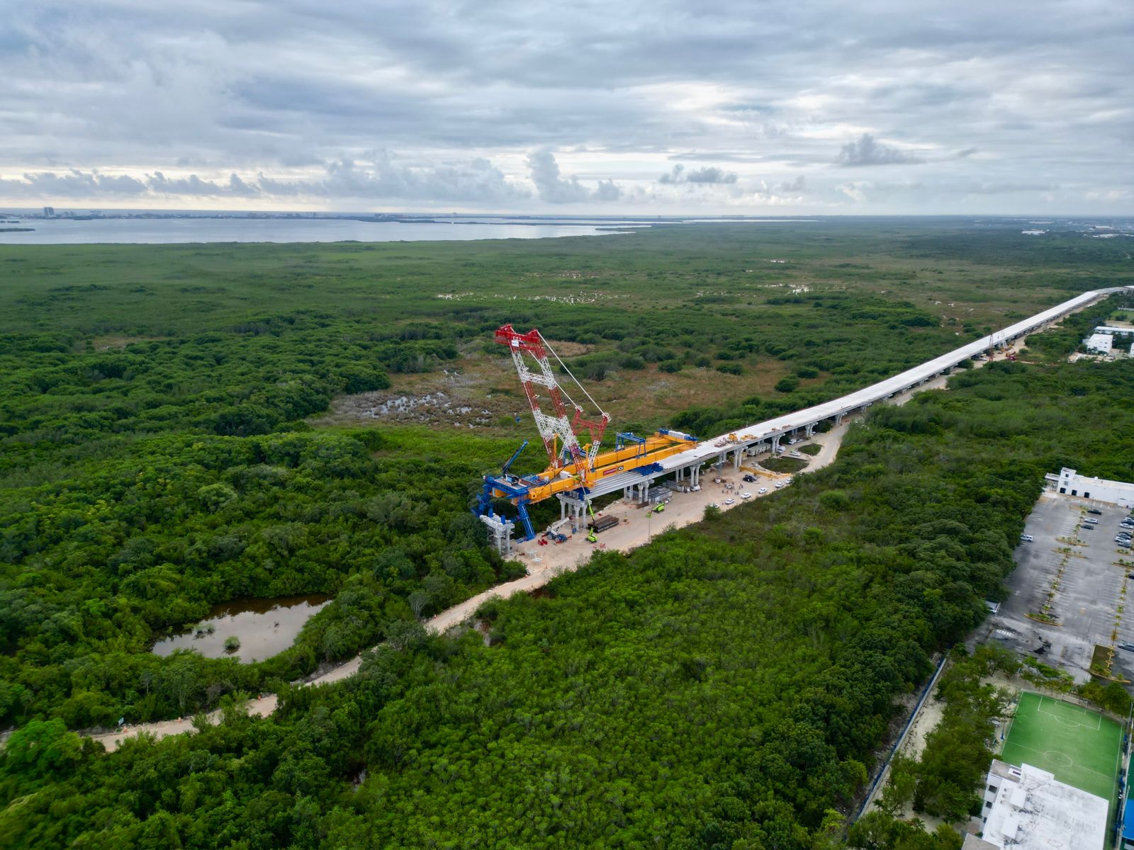 En el detalle, los expertos explicaron que la obra tiene cuatro tramos de trabajo divididos en: entronque Colosio, zona terrestre, zona manglar, zona lagunar, y entronque Kukulcán, así como el arco metálico, en los cuales de manera general, se indicó se encuentra el proceso de armado del andamiaje, colocación de pilotes, montaje de trabes, entre otros, mientras que en el patio del bienestar, se mantiene la fabricación de los prefabricados como son las trabes, cabezales y prelosas.
