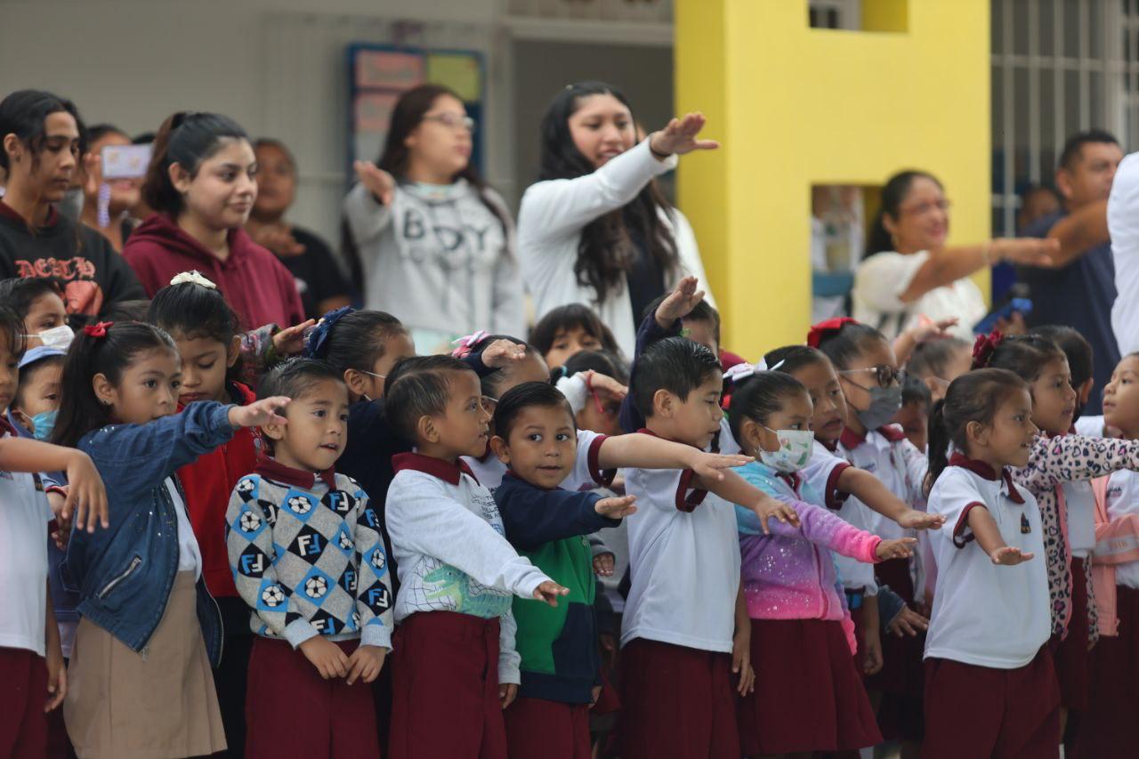 A su llegada al evento, la Primera Edil fue recibida por las niñas y los niños emocionados, a quienes les reafirmó que este espacio nuevo es gracias a la visión del Presidente Andrés Manuel López Obrador, de hacer las cosas diferente, de gobernar de una manera distinta. Además, recordó que en esa escuela es la segunda ocasión que se realiza una inversión con recursos federales, ya que anteriormente se construyó un domo; y reafirmó que como gobierno municipal trabajarán para mejorar la colonia, con un nuevo parque para beneficio de todos los vecinos.